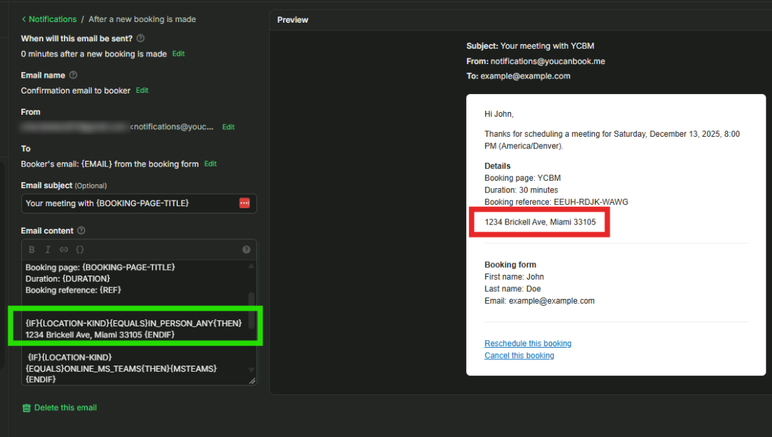 {IF}{LOCATION-KIND}{EQUALS}IN_PERSON_ANY{THEN} 1234 Brickell Ave, Miami 33105 {ELSE} Please, use the following link for our meeting {GOOGLEMEET}{ENDIF}