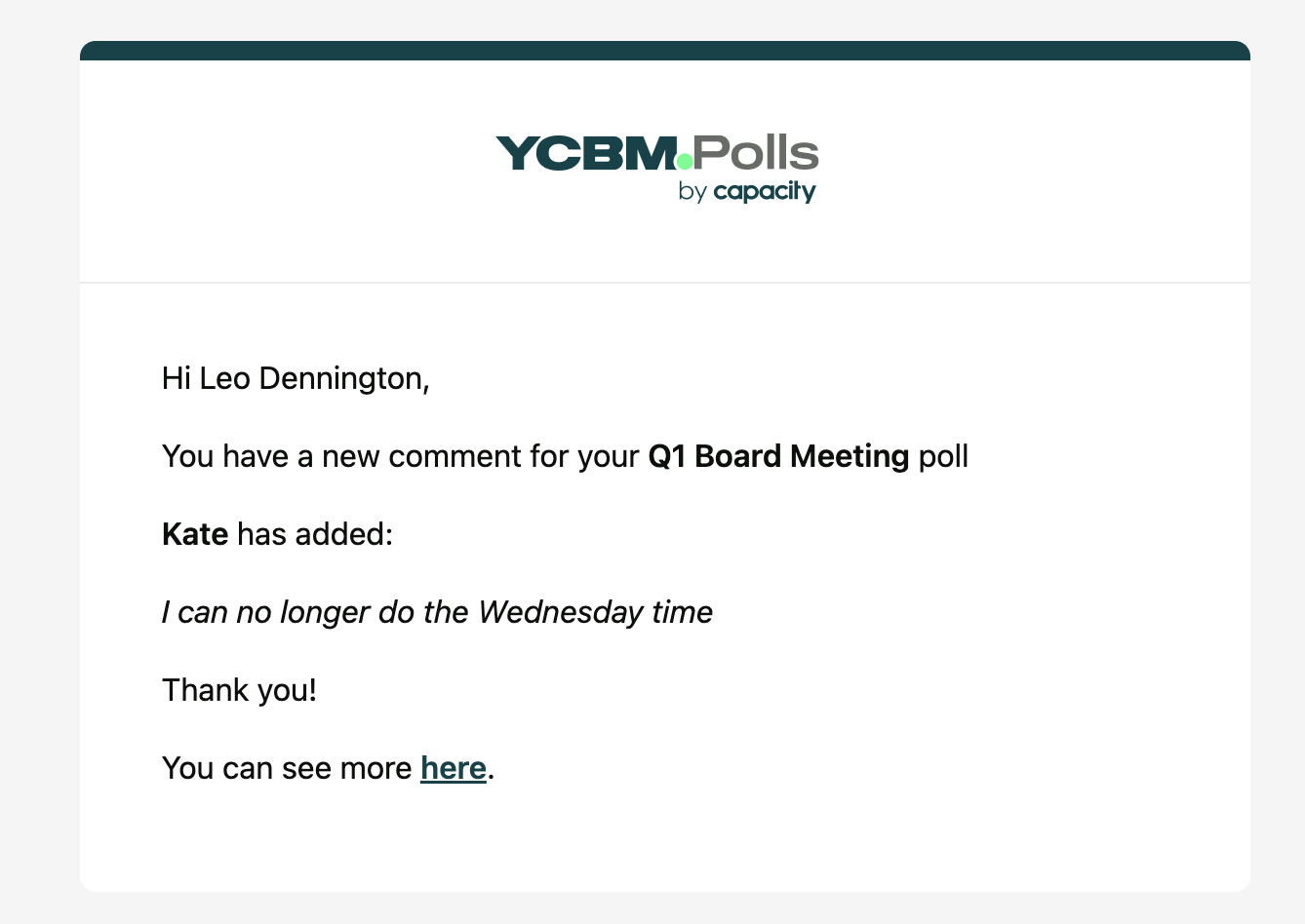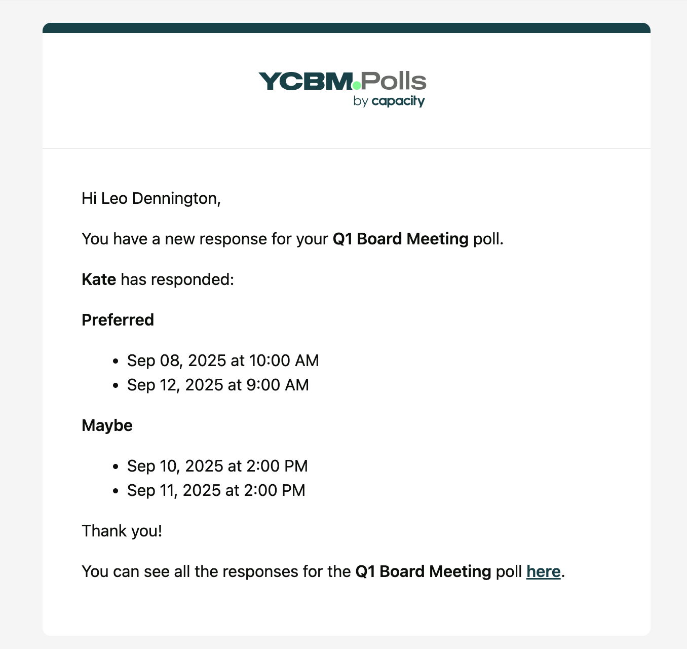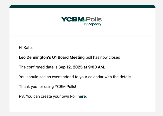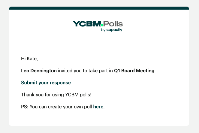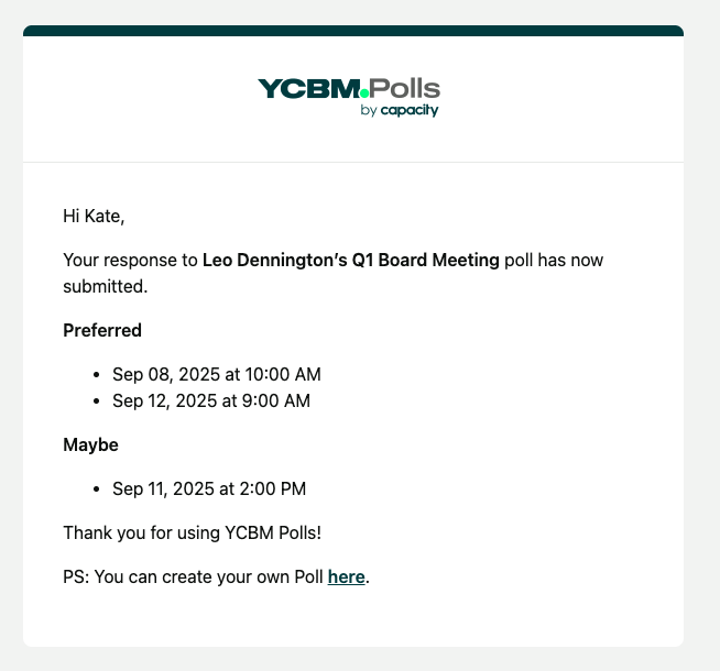 When someone responds to a poll, they will receive a confirmation email detailing their selections ...